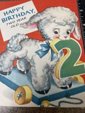 Vtg Greeting Birthday Card MCM Anthropomorphic Lamb 2 Year Old Pull Toy Wagon