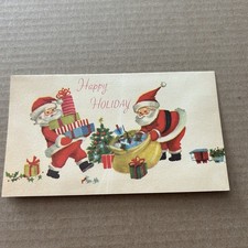 Vintage Mid-century Christmas Card Two Santa’s Pastel Toys Tree Retro