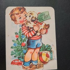 Vtg Rust Craft Christmas Greeting Card M. Cooper Boy Puppy Dog Tree Toy Car Ball