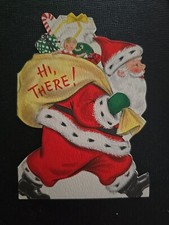 Vtg Hallmark Christmas Greeting Card Diecut Santa Claus Toys Doll HI THERE!