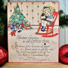 VTG Christmas Greeting Card Mechanical Girl Rocking Chair Toys Rust Craft 1950s