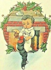 Christmas Vintage Good Cheer Greeting Child with Stocking Fireplace Toy Embossed