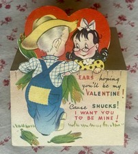 Vintage Mid Century Die-Cut Valentine Corn Farmer & Girl Stand- Up Card