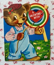 Vintage Mid Century Die-Cut Teddy Bear Archer in Overalls Valentine Card
