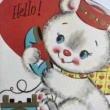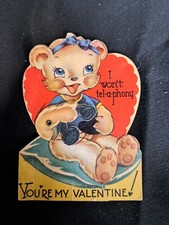 Vintage Mid Century Valentines Day Greeting Card Cute Bear Old Style Telephone