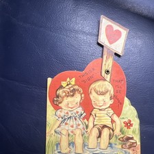 Vintage Valentine Card Boy Girl Lake Fish Mechanical Sign Mid Century USA