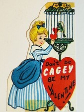 Valentine Card Used MCM Bird Birdcage Don’t Be Cagey Mid Century Love Heart