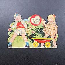 Vintage 1930s Valentine, Secret, Children, Toy Wagon, Pink Roses