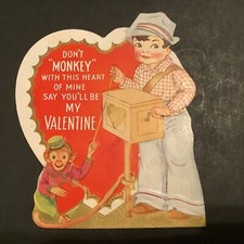 Vintage Die Cut Valentine Cute Boy & Monkey Hat Wind Up Toy Crank Box Madein USA