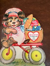 Vtg Mechanical Lg Valentine Dog on Tricycle Pop up Basket Don't Toy w My Heart