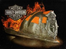HARLEY DAVIDSON FIREMAN'S HAT FLAMES HEAVY DUTY USA MADE METAL ADVERTISING SIGN