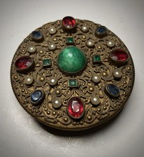Antique/VTG Jeweled Ormolu Powder Compact w/ Puff & Mirror Art Nouveau Czech?
