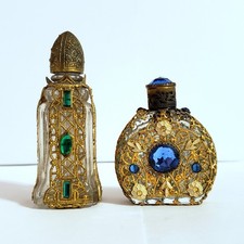 🎡 Set of 2 Antique Czech Brass Filigree Perfume Bottles Rhinestones 🎡