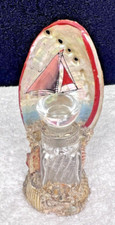 Antique Seashell Art Perfume Bottle Stand w Bottle & Hand Painted Sailboat Shell