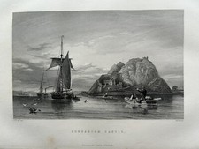 1850 View of Dumbarton Castle with Ship in Foreground Scotland Antique Engraving