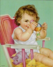 Charlotte Becker, Baby Girl High Chair, Toy Pig 9.75"x7.75" Sample Print Vintage