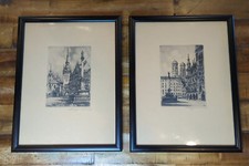 Vintage 1940's Framed German Prints. Munich Cathedral and Munich Toy Museum