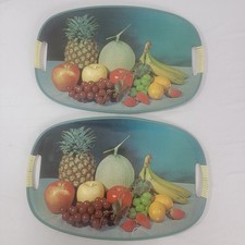 2 Vintage 17" MCM Mid Century Modern Serving Trays Blue Japan Fruit Lacquerware