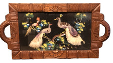 Large Mid Century Mexican Folk Art Feather Bird Painting Plumaria Serving Tray