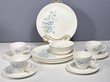 Vintage Earthenware Blue Floral Luncheon Set 16 Pc Mid Century Plates Cups Bowls