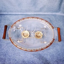 VTG Mid-Century Modern Inland Glass Meat Platter & Warming Stand Teak Handles