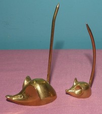 Vtg Pair Mid Century Brass Mouse Paper Weight Receipt Holder, Long Pointed Tail