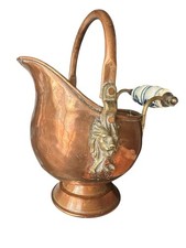 VTG Antique Copper Brass Coal Scuttle Bucket Lion Head Delft Ceramic Handle Read