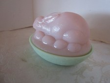 Fenton Art Glass bunny pink nest of eggs jadeite lidded candy dish 7” W signed