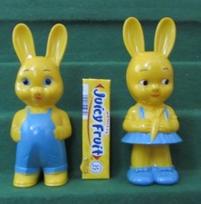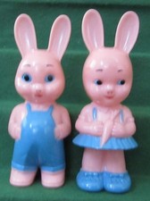 2 VTG KNICKERBOCKER PLASTIC BOY & GIRL RABBITS TOY RATTLES, EASTER + FREE SHIP