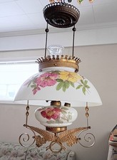 Antique Cast Iron Brass Pull Down Library Parlor Ceiling Lamp, Painted Flowers