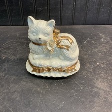 Vintage 1997 LEFTON Porcelain Ivory CAT Figurine Gold Accents Music Box As Is