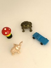 set of 4 vintage miniature toys display frog, elephant, mushroom & car