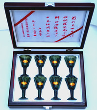 SET OF 8 ANTIQUE CHINESE HAND CARVED JASPER/SPINACH JADE WINE CUPS w/ Orig Box