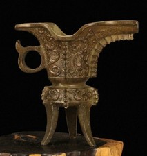 Antique Chinese Bronze Ceremonial Ritual Tripod Wine Jue Vessel Cup Cat Handle