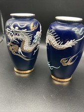 Antique Japanese Hand Painted Dragon Porcelain Vases Flow Blue Style Urn 5.5”