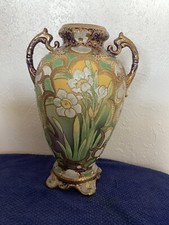 Vintage Satsuma Style Moriage Porcelain Hand Painted Floral Handle Urn Vase