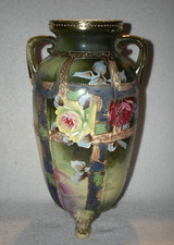 Antique Nippon Hand Painted Floral Urn/Vase 2 Sided Design With Pretzel Handles