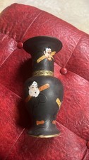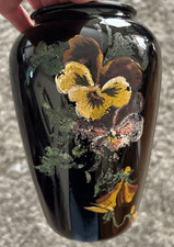 Vintage Hand Painted Black Glass Vase Floral Pansy Enamel Decor 7'' Urn Style