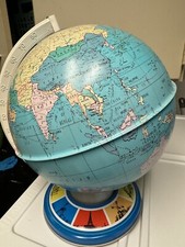 Vtg Tin Toy Globe Mod Century Ohio Art 12”Litho Print 8 World Wonders Globe Read