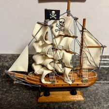 Vintage Wooden Pirate Ship Model Nautical Decor Jolly Roger Sails 9.5”