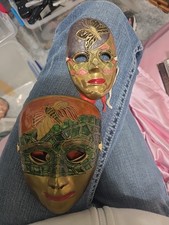 Vintage Solid Brass Hand Painted Wall Decor Theater Masquerade Masks 4.25”x5.5”