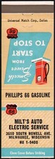 Vintage matchbook cover PHILLIPS 66 pump pic Milts Milwaukee Wisconsin unstruck