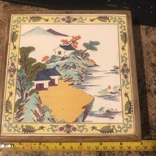 Asian Countryside Mid-century Modern Ceramic Art Tile Encased in Wood