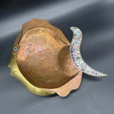 Mid Century Hammered Brass Copper Fish Dish Abalone Shell Inlay Mexico Footed