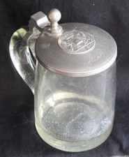 Antique German Glass Beer Stein with Pewter Lid, Coat of Arms Emblem & Monogram