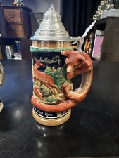 GERMAN BEER STEIN FOX HANDLE HUNTING DIE GRUNE HEID - Germany Deer