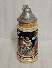 Vintage German Beer Stein Pewter Lidded Ceramic Made in Germany Tavern Scene