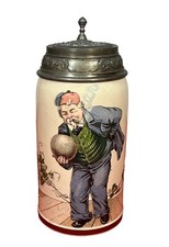 Antique c. 1910 Bowling Motif Mettlach 1/2L Lidded Porcelain Stein Mug Old Early