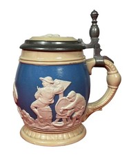 Antique c. 1900 Bowling Scene Relief Mettlach 1/2L Lidded Porcelain Stein 3/10 L