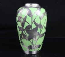 BEAUTIFUL 10" ART NOUVEAU GREEN ART GLASS VASE WITH STERLING SILVER OVERLAY